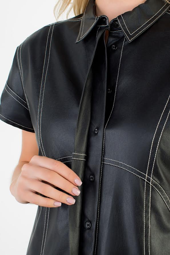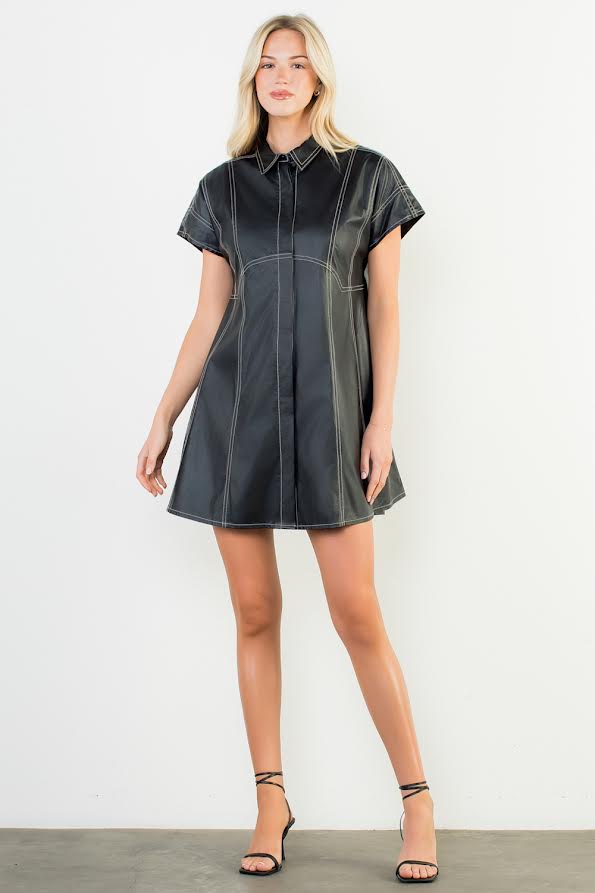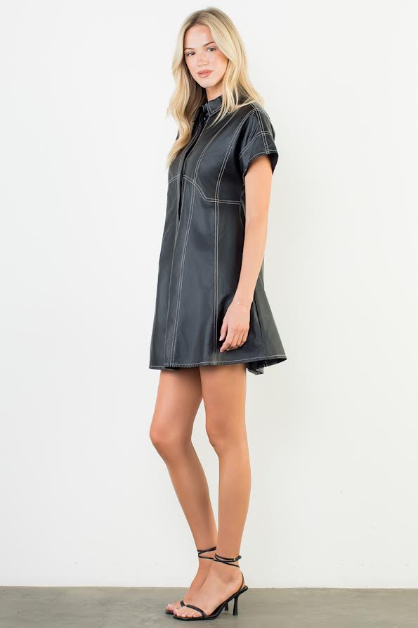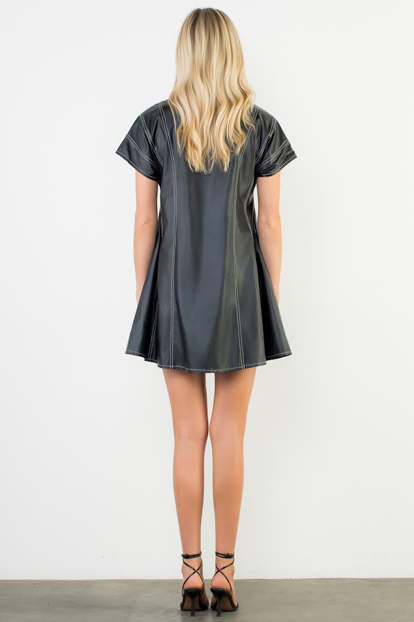 The Arlette Vegan Leather Mini Dress is crafted from buttery-soft black vegan leather and detailed with contrast white stitching for a sleek, elevated finish. Its tailored silhouette and short hemline strike the perfect balance between playful and polished.